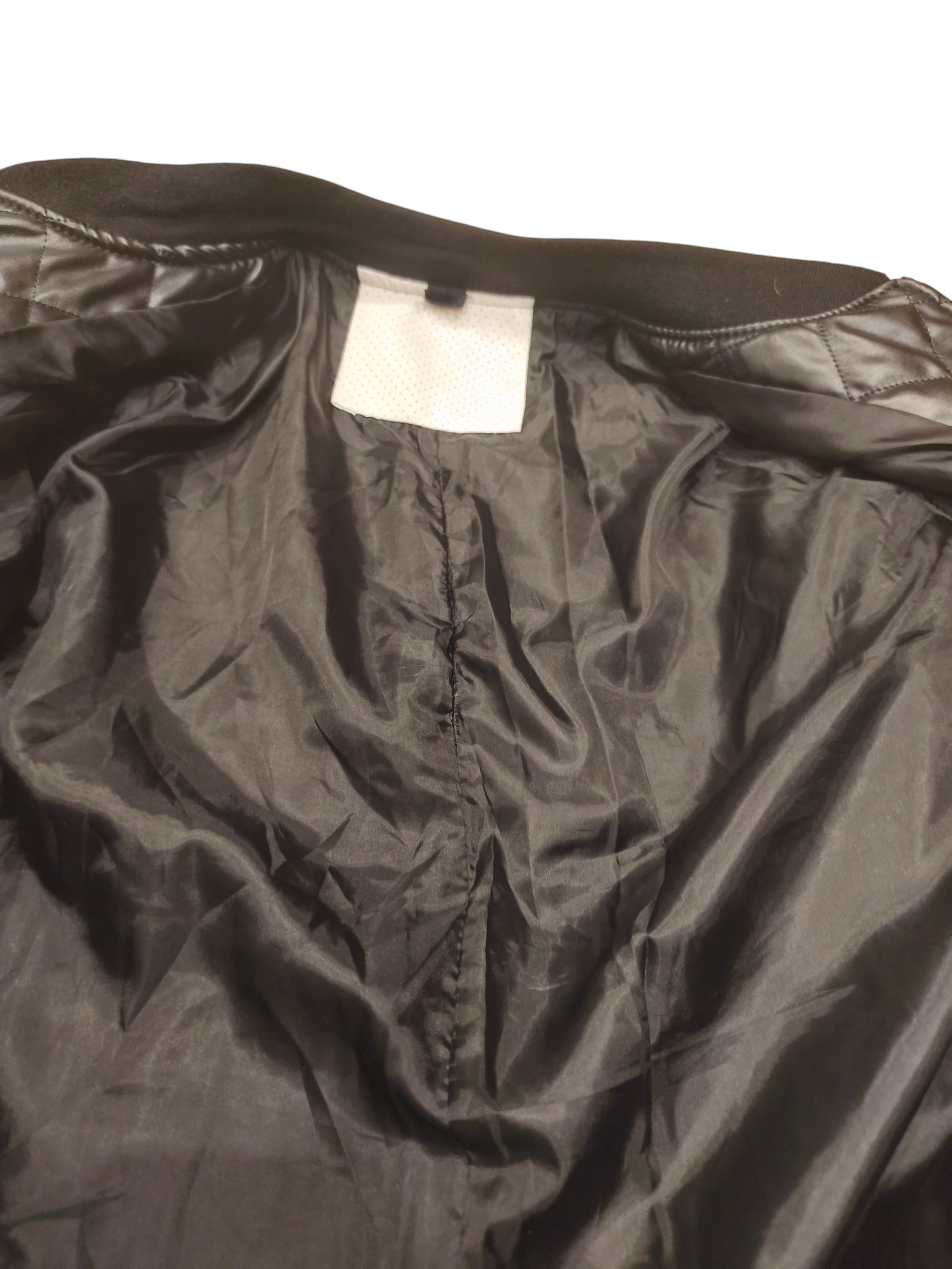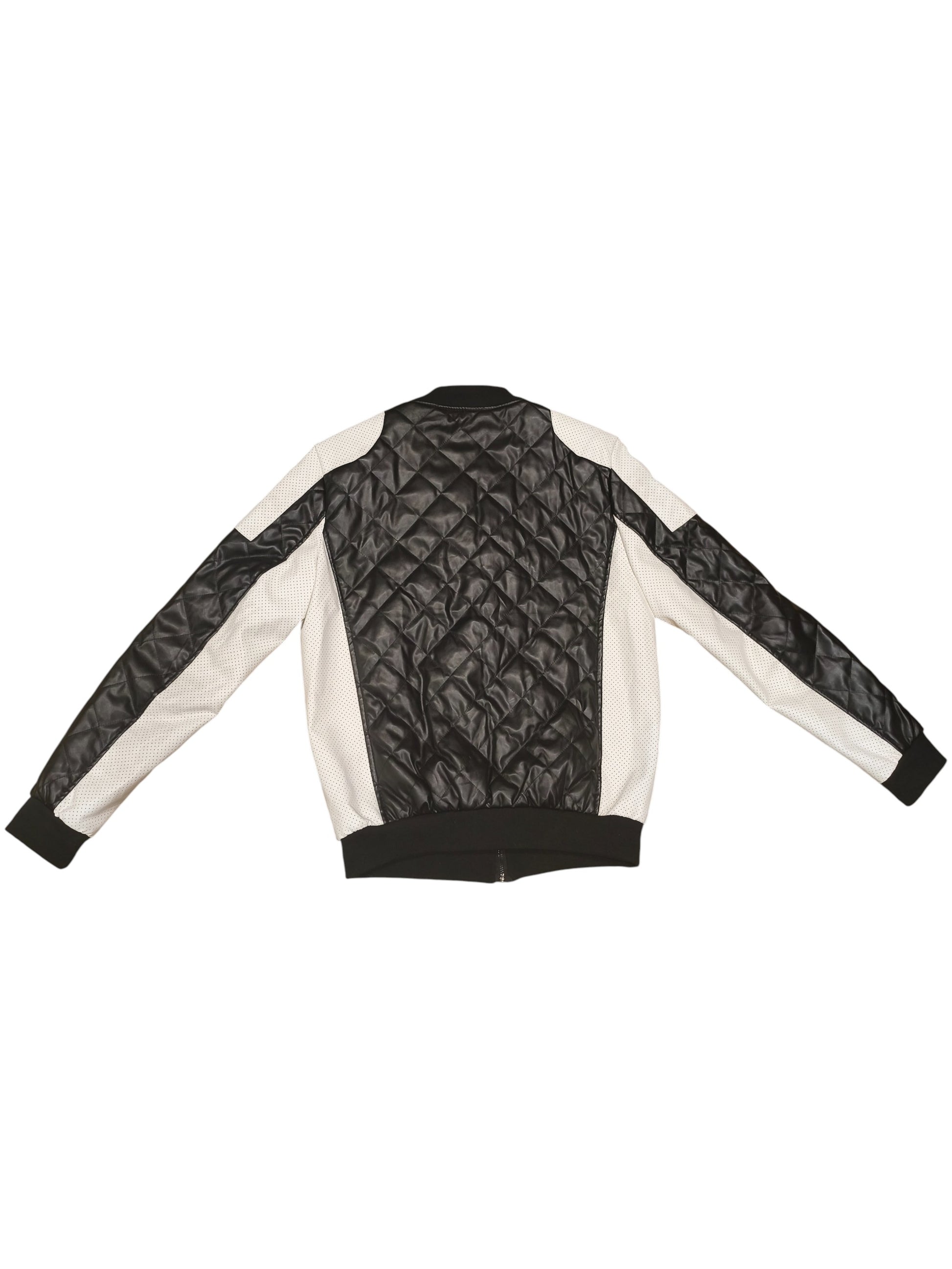 Elevate your style with this modern, urban-inspired bomber jacket. This jacket features a unique combination of textured black quilted faux leather and sleek white perforated panels. It's the perfect middle ground between a classic varsity jacket and a rugged biker style.