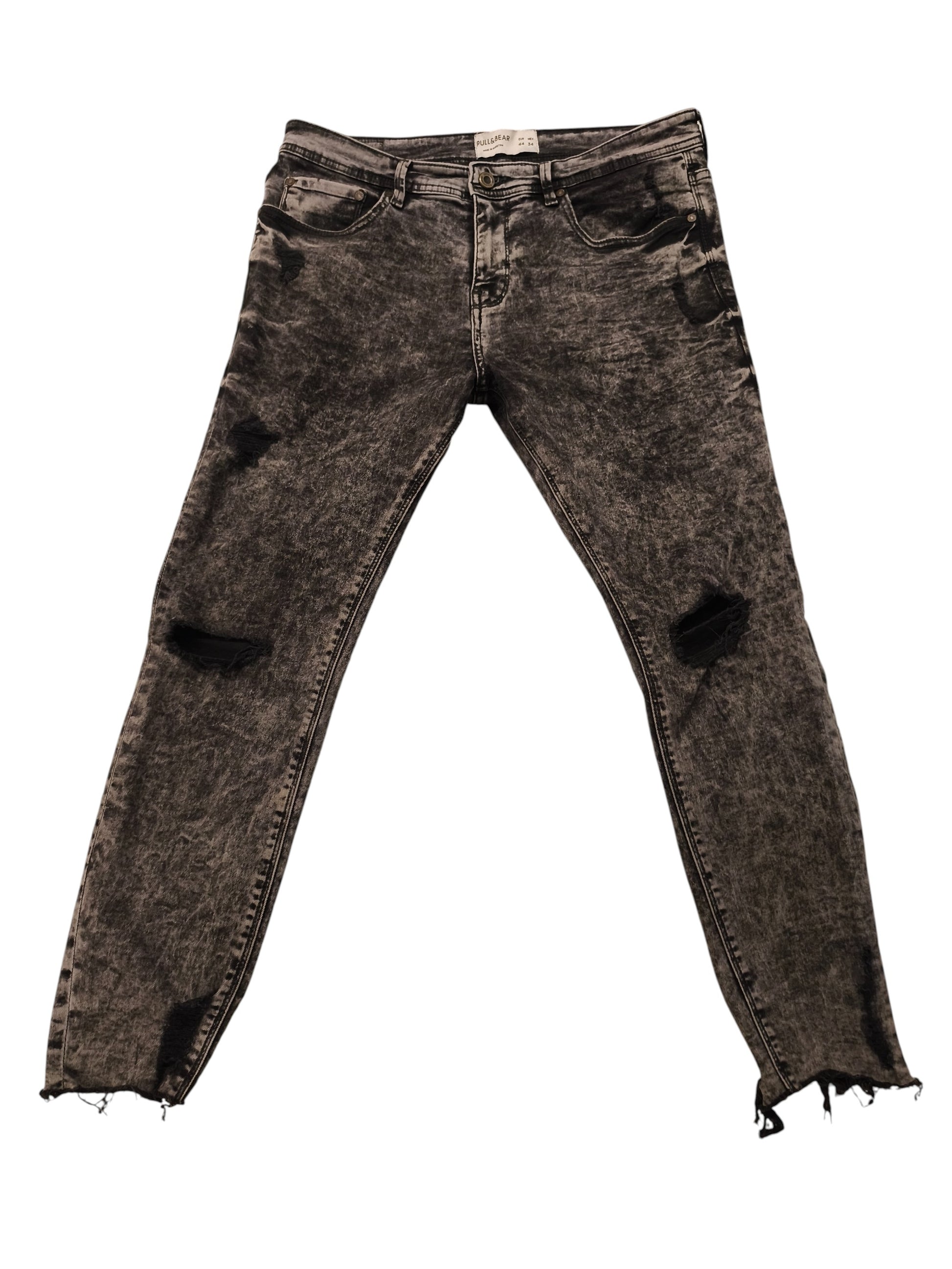 Up for sale is a pair of high-quality, acid-wash jeans from Pull&Bear. These feature a unique faded grey finish with intentional factory-made rips and distressing for a modern streetwear aesthetic.
