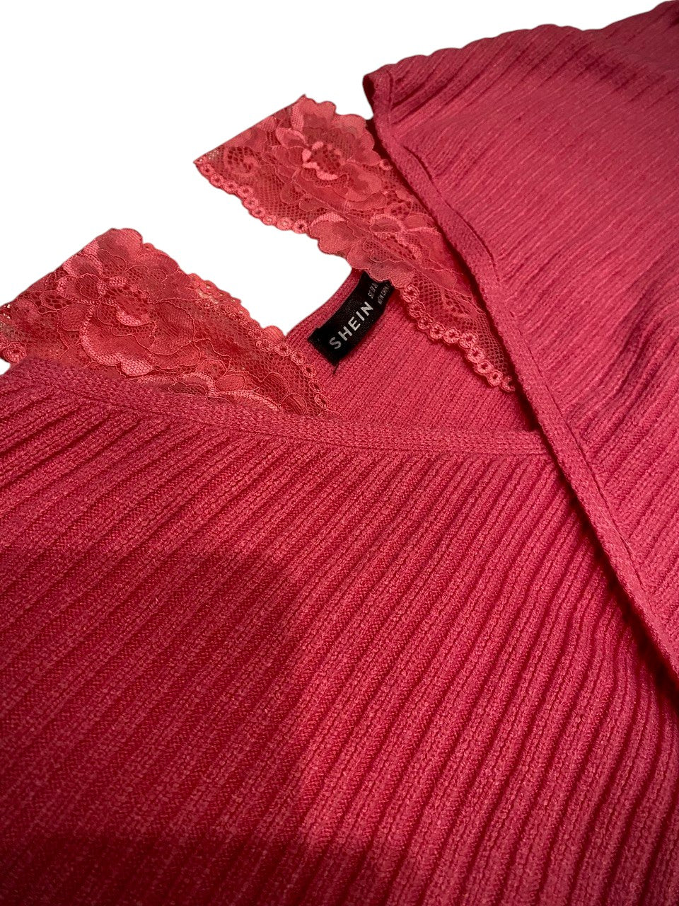 SHEIN Pink Ribbed Knit Surplice Sweater Lace Trim V-Neck Long Sleeve Crop Top S