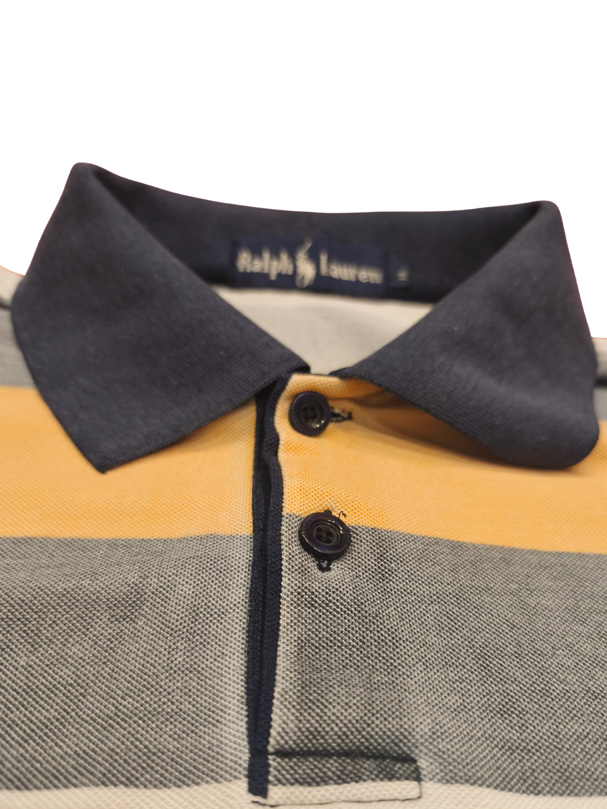 Vtg 90s Ralph Lauren Polo Shirt Medium M Striped Rugby Yellow Navy Grey Pique